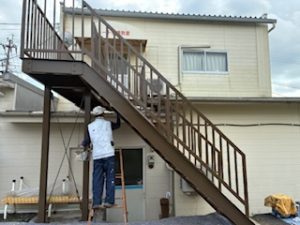 ちょうどキュート2階の健康教室に上がる鉄骨階段の塗りなおしをプロの塗装屋さんに